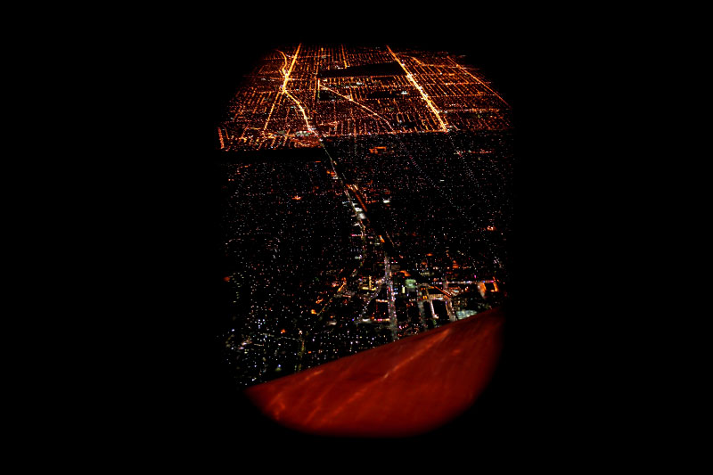 Airplane window city night